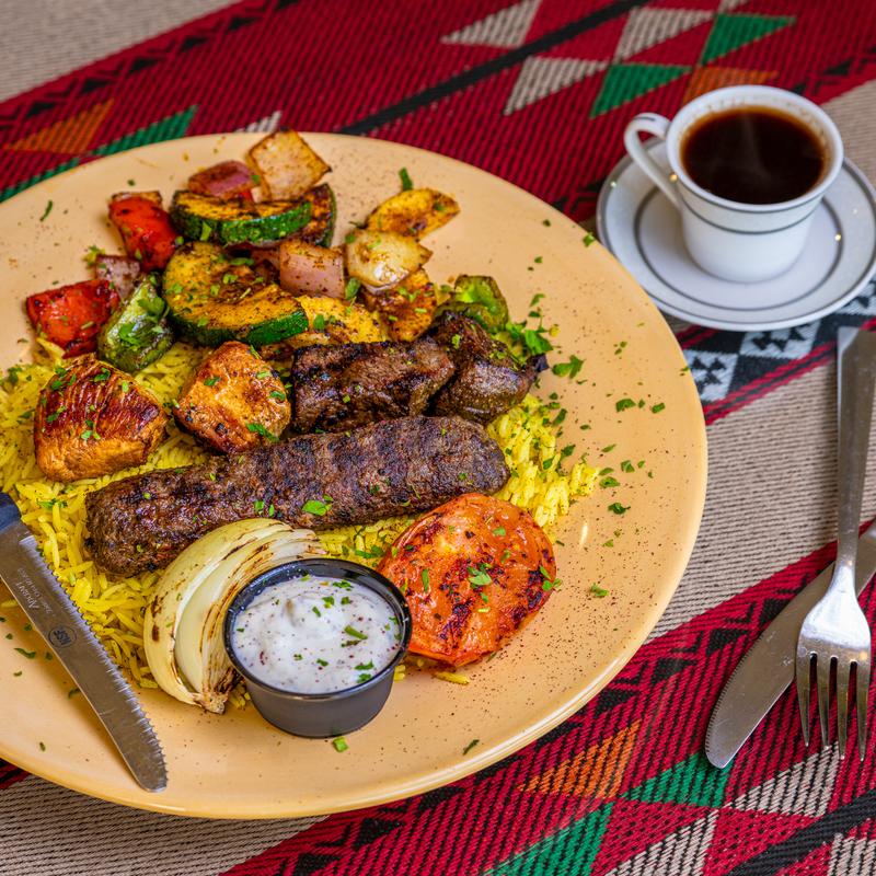 Ground beef mixed with parsley and onions, grilled to perfection. Served over basmati rice, grilled vegetables, and tzatziki sauce.