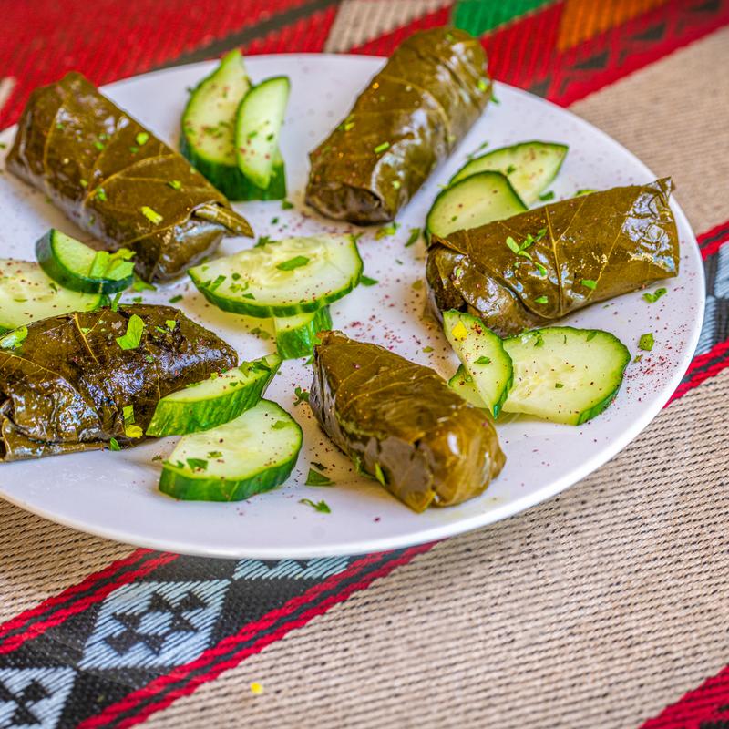 Grape leaves stuffed with savory rice, vegetables simmered in a tangy broth of lemon juice and olive oil.