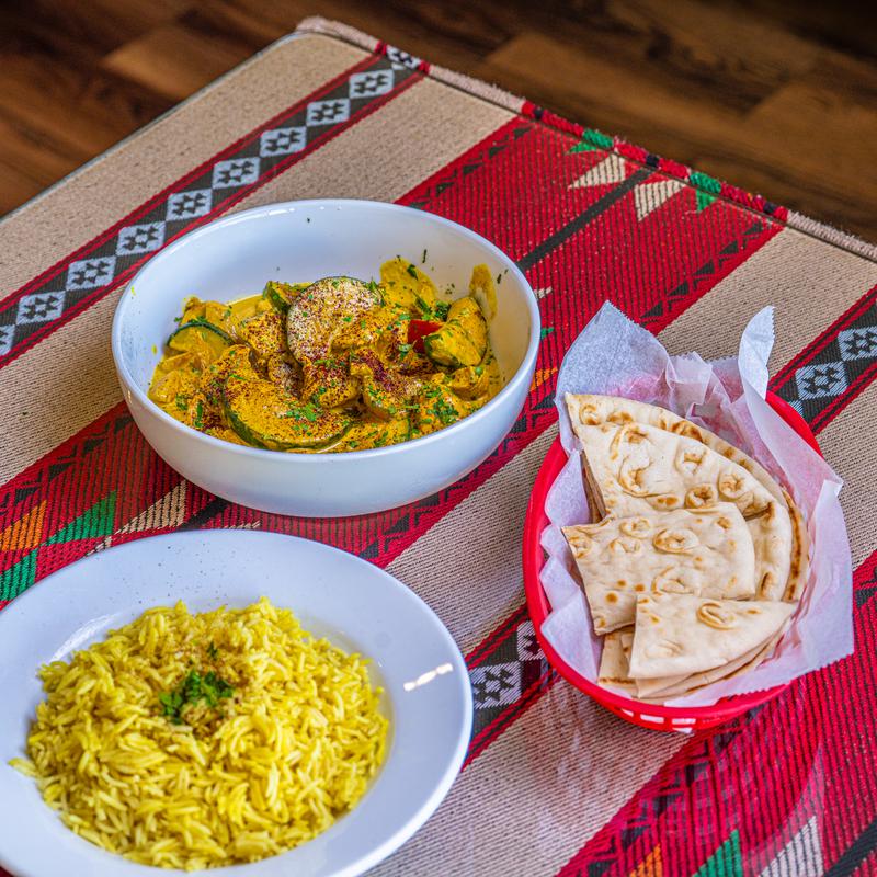 Chicken $12.50 | Beef $14.50 | Lamb $14.50 • Spicy or mild chicken, beef, or lamb cooked with rice, vegetables, and biryani seasoning. Served with tzatziki sauce.