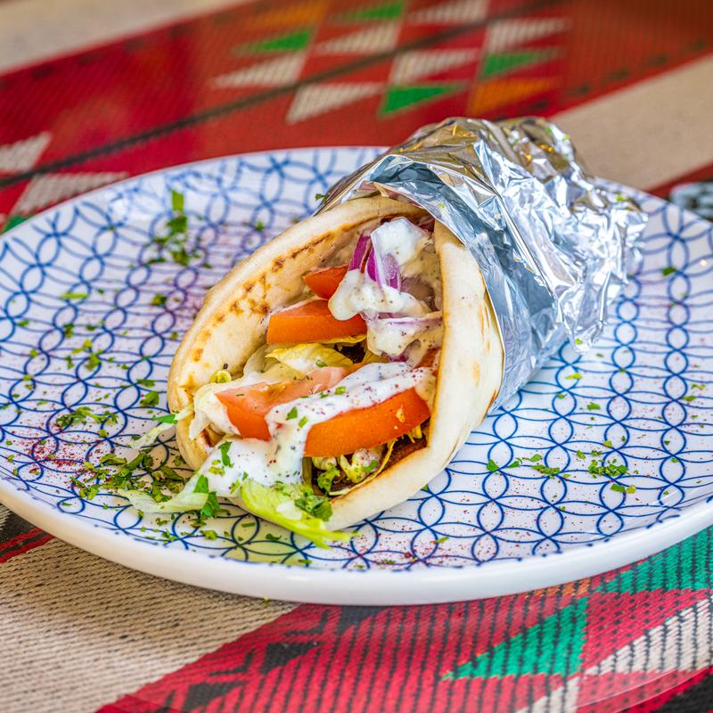 Grilled chicken or beef gyros meat stuffed in pita packets with lettuce, tomatoes, onions, and tzatziki sauce.