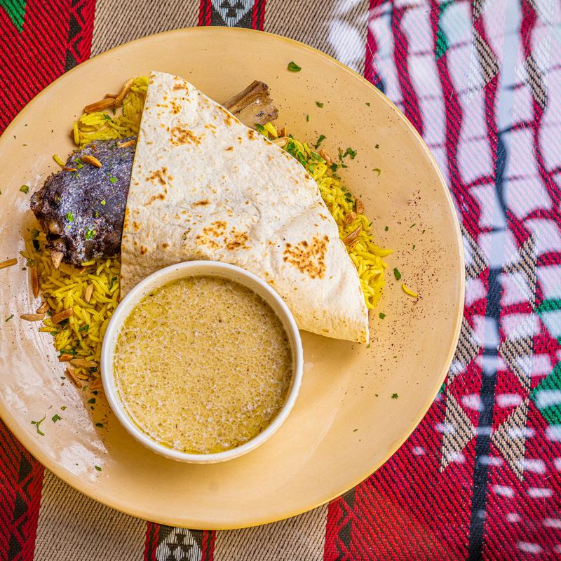 Tender lamb shank served over Basmati rice with toasted almonds, parsley, bread, and tangy yogurt sauce.